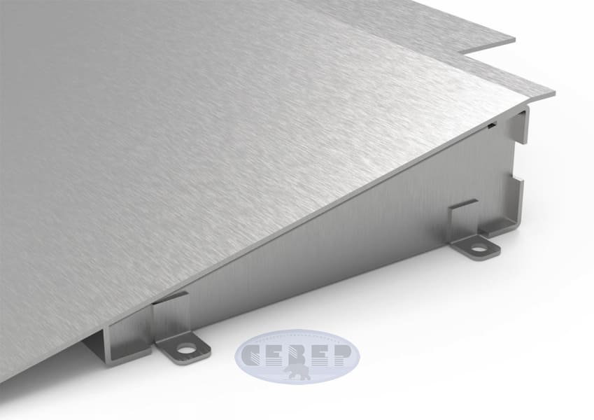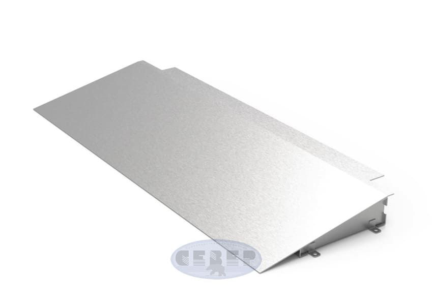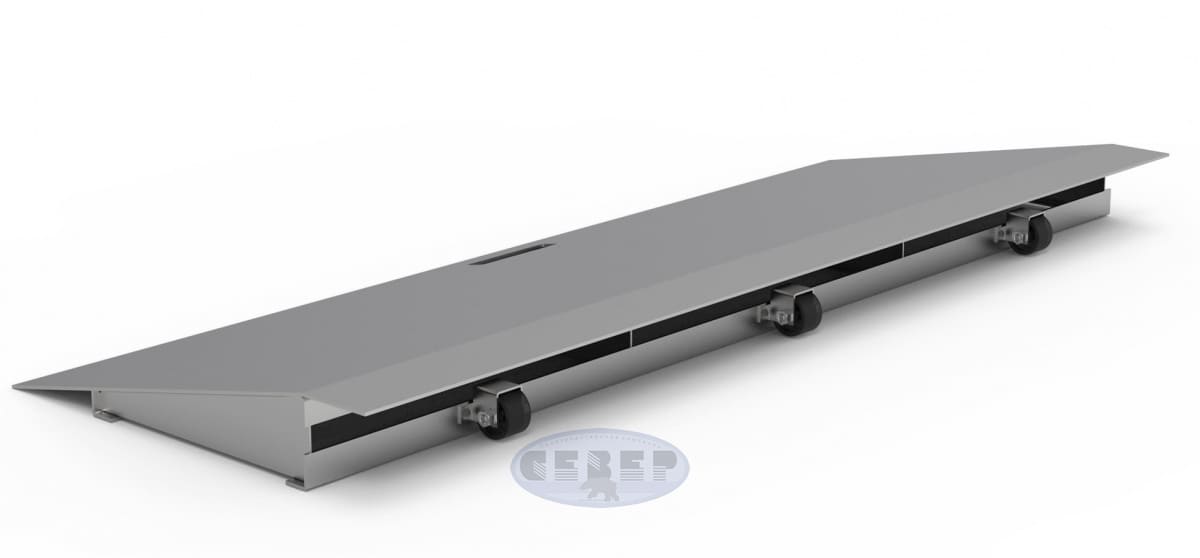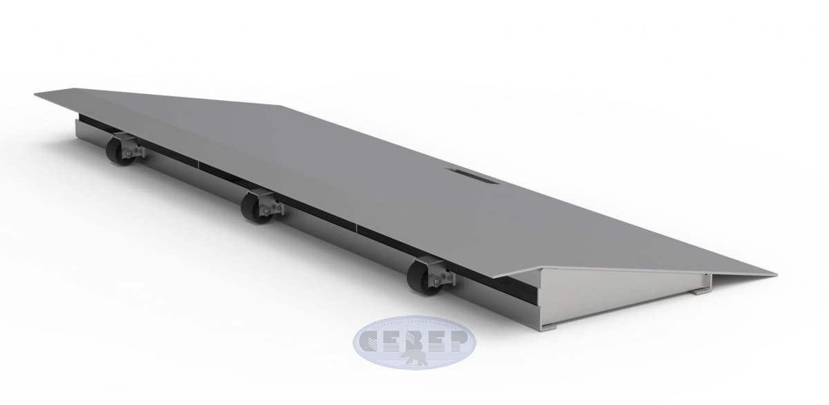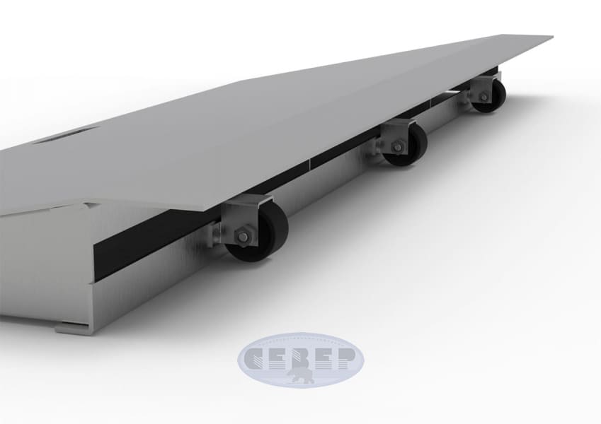 Конструкция откатного пандуса позволяет легко перемещать его к дверному проему камеры за счет установленных с обратной стороны настила полиамидных роликов.